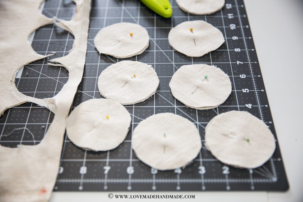 I used pins to secure two pieces of the fabric to make these double layered. The pins kept each round separate from the others so when it was time to sew, I just had to pick it up and sew without worrying if I had 3, 4, or 5 layers of fabric pieces stuck together. This streamlined my work flow and ultimately proved to be a time saver.